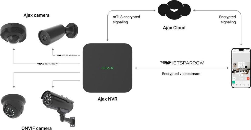 Videolagringsenhet (NVR) för 8 kameror utan hårddisk. NVRen ger en fullständig kamerasynkronisering in i Ajax-systemet. NVRen måste anslutas till en centralapparat Ajax Hub.