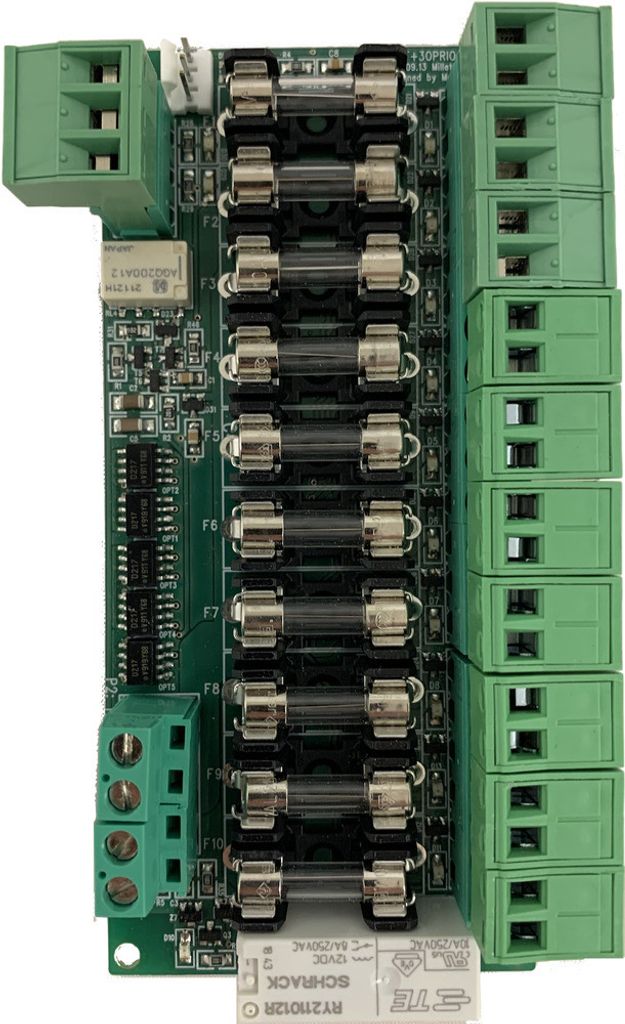 BT-Fuse-10 är en avsäkringsmodul med sju prioriterade (=alltid spänning) utgångar och tre oprioriterade utgångar.