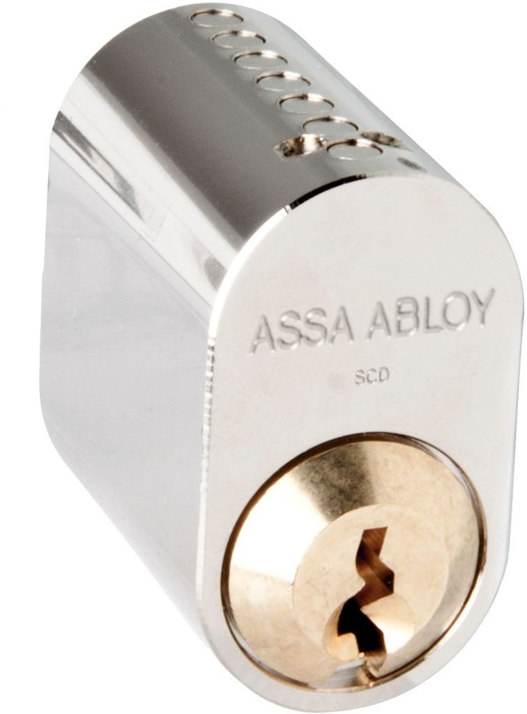 SB-packad ovalcylinder av standardtyp, utsida. Stiftcylinder med 7 spärrelement. Borr-, dyrk- och manipulationsskyddad. För inom- och utomhusklimat. Med eller utan lika låsning. Certifierad enligt SSF 3522 utgåva 2.