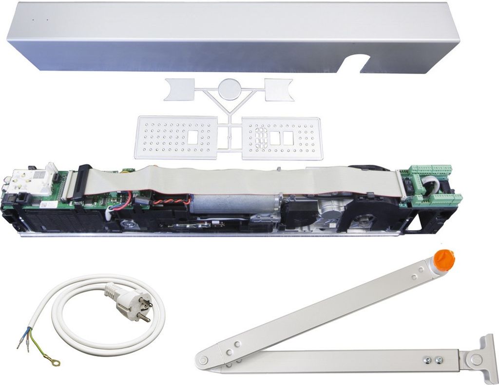 Dörrautomatik ED 100 NY med automatikhus, kåpa, standardarm och nätkabel.