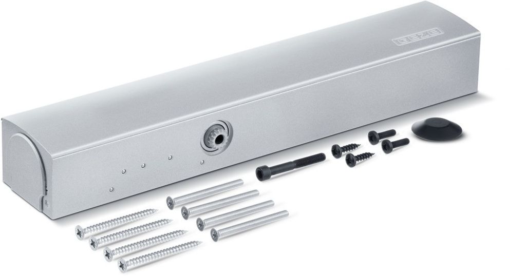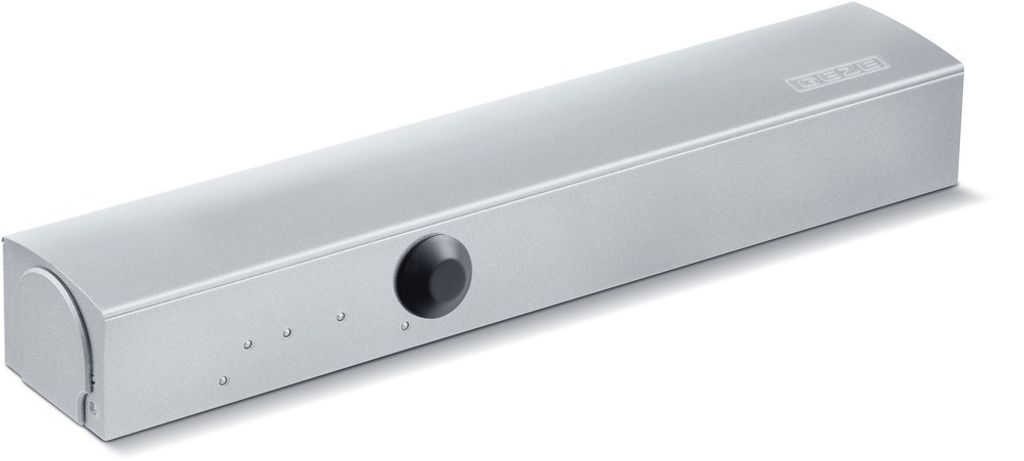 GEZE TS 4000 E karmmontage med elektrohydraulisk uppställning 80-175° enligt EN 1155, 24 V DC utan standardarm. Framifrån justerbar stängningshastighet och stängningskraft (storlek 1-6). Karmmontage på anslagssidan.