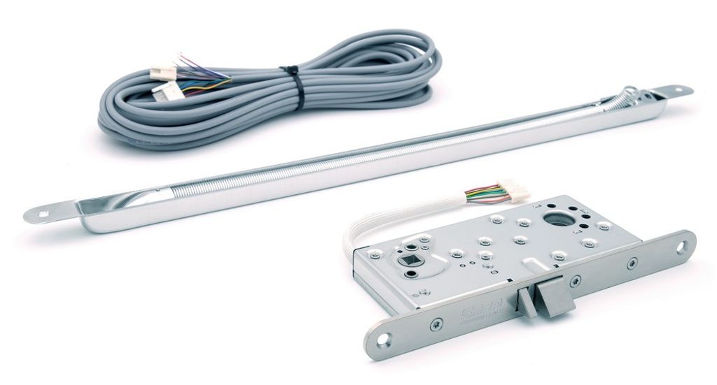 Set som innehåller STEP 110 eltryckeslås, en karmöverföring och 10 m anslutningskabel. Fjädern har en innerdiameter på 10,8 mm. Anslutningskabeln är halogenfri, 10 m lång och har 12 ledare.