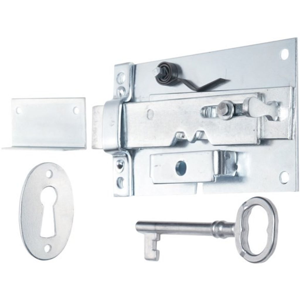 Utanpåliggande regellås. Används för äldre dörrar till lager, magasinsbyggnader, förråd och djurstallar. Öppnas från utsidan med nyckel och från insidan med dragknapp. Levereras förzinkat med 1 st nyckel längd 120 mm, vinkelslutbleck samt nyckelskylt. Nyckel Fas 1405.
