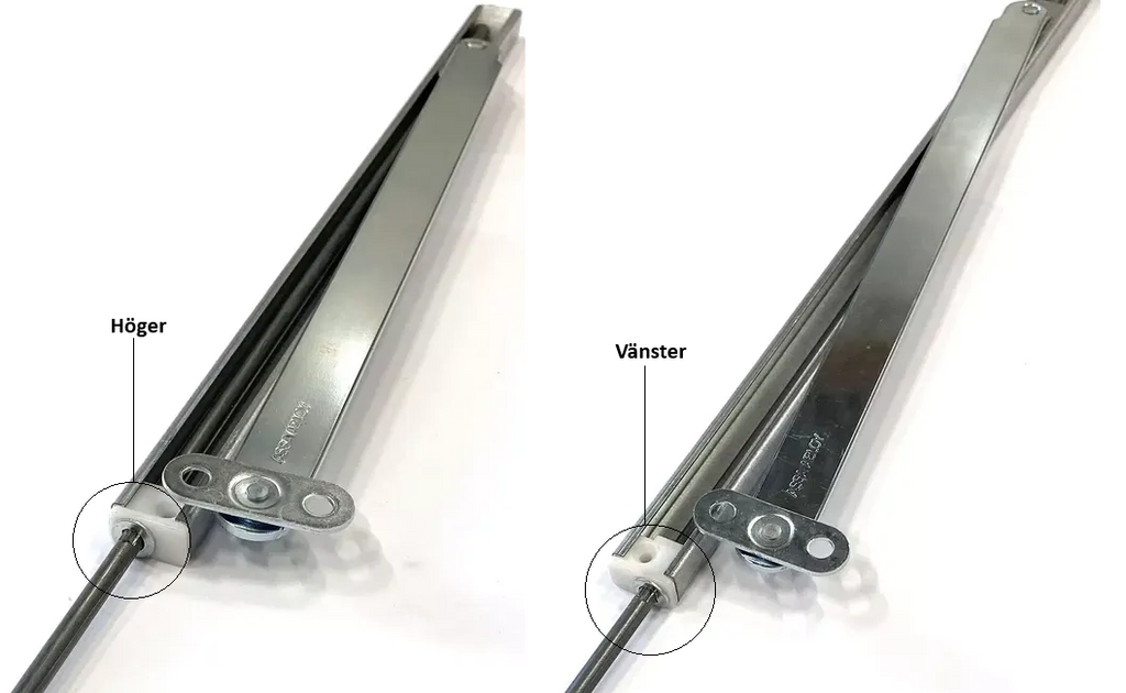 - Valet höger eller vänster har inget med gångjärnens placering att göra. Det avgörs istället av vilken sida stången kommer ut från bromslådan.