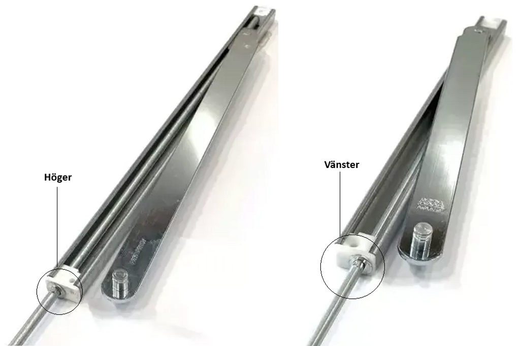 - Valet höger eller vänster har inget med gångjärnens placering att göra. Det avgörs istället av vilken sida stången kommer ut från bromslådan.