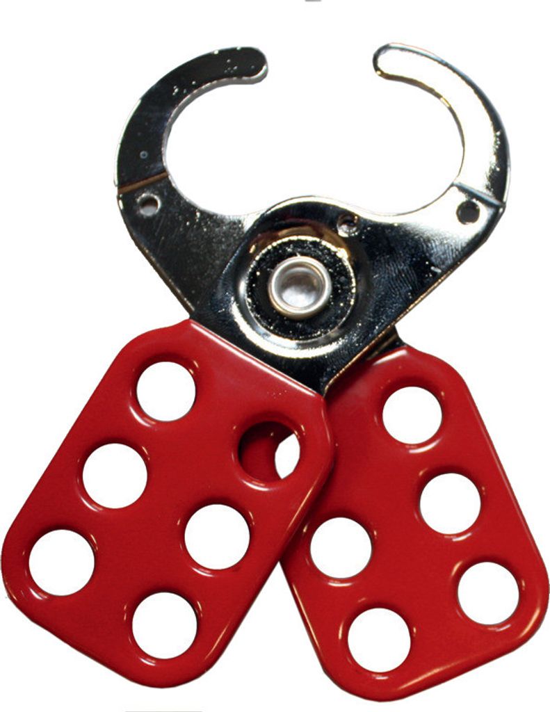 Upp till sex hänglås kan användas till respektive hasp. Flera användare/underhållsarbetare kan låsa och ansluta sig till haspen när arbete sker. Haspen är tillverkad i stål.