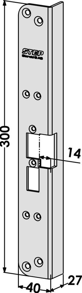 Monteringsstolpe i rostfritt stål för STEP 60 som passar där urtag i karm gjorts för STEP 18 & STEP 28 vänster (vinklad stolpe ST184-A, ST284-A). 300x40x27 plösmått 14 mm.