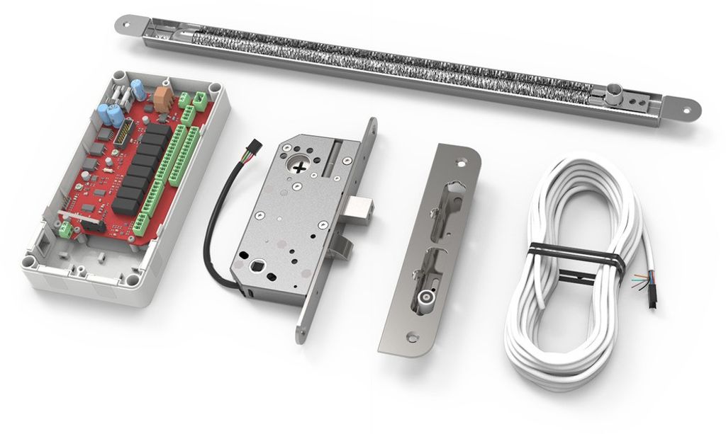 SAFETRON motorlås 5250 i satsförpackning. Satsförpackningen innehåller: motorlås 5250, styrenhet 5000, anslutningskabel C01 (10m), slutbleck 106-2 samt karmöverföring CT81.