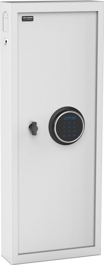Nyckelskåp MBG 150 är den största modellen i nyckelskåpserien och är tillverkat i 1,8 mm stålplåt i väggarna samt 3 mm stålplåt i dörren. Nyckelskåpet är utrustat med ett omprogrammerbart elektroniskt kodlås med LED belysning och touch display samt en låsbar deponeringsöppning för eventuell återlämning av nycklar. Skåpet är utrustat med 150 krokar. Fastbultning möjlig genom 2 hål i ryggen på skåpet (2 st bultar ingår)