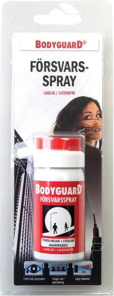 Licensfri och registrerad av SKL. En spray med rödfärg- och alkoholblandning. Från ca två meters håll kan du förblinda förövaren i flera minuter, färga dennes kläder och hud för att underlätta identifikation. Irritationen sitter kvar i ca 5 minuter. Färgen försvinner efter ca 1 vecka men kan tvättas bort med rotborste och såpa. Kan färga ljus mocka permanent. Ett utmärkt alternativ eller komplement till överfallslarm. Mått 80x35 mm. Rekommenderas ej till personer under 18 år. Konsumentförpackning.